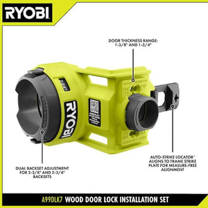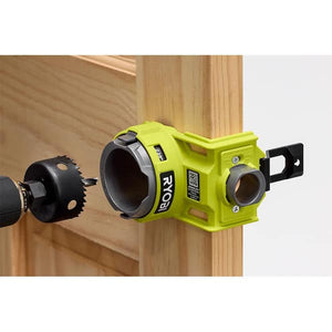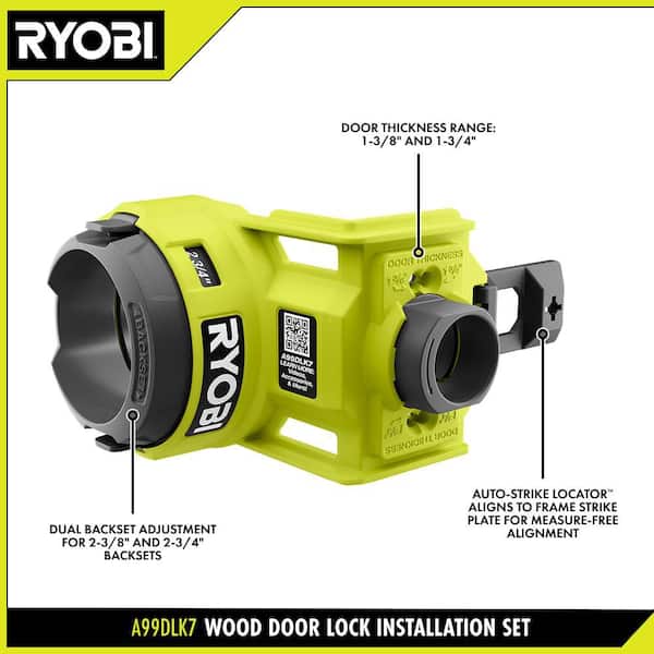 The RYOBI wood door lock installation kit is designed to simplify the process of installing door locks on wood doors with accurate and consistent results. This kit includes the essential cutting and drilling components needed to prepare door hardware openings efficiently.