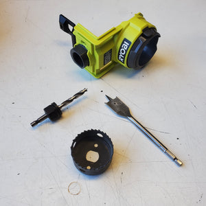 This unit is sold as open box and barely used. All components have been inspected and confirmed to be in good condition. Minor cosmetic signs of handling may be present. The kit includes a wood hole saw, spade bit, pilot bit, and double-ended screw driving bit.