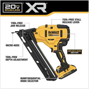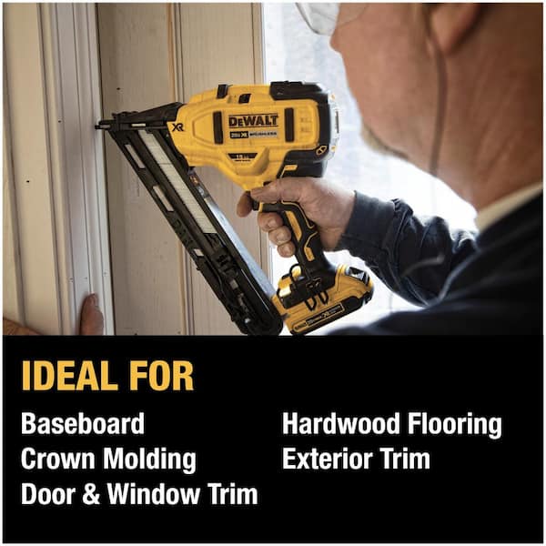 Powered by DEWALT’s XR brushless motor technology, this cordless finish nailer delivers strong, consistent driving power without the need for compressors, hoses, or gas cartridges. The 15-gauge nail capacity provides excellent holding strength, while the ability to drive nails up to 2-1/2 inches makes it suitable for heavy trim applications. The included 2.0Ah battery, charger, and contractor bag provide a complete, job-ready solution right out of the box.