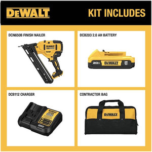 This kit includes the 15-gauge cordless finish nailer, a 2.0Ah battery, charger, and a contractor bag.