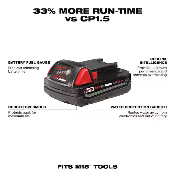 The Milwaukee 48-11-1820 M18 18V 2.0 Ah Lithium-Ion Compact Battery is designed to power Milwaukee M18 cordless tools. This compact battery delivers 18 volts of output and 2.0 amp-hour capacity, making it suitable for lightweight and general-use applications.
