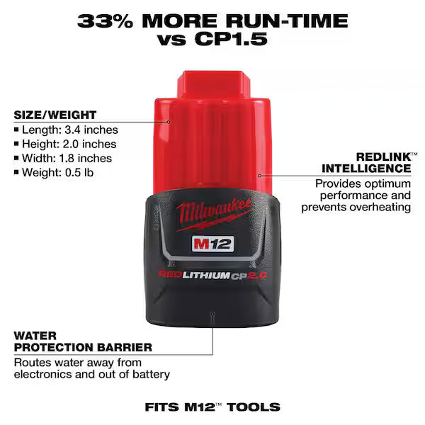 The compact design helps reduce overall tool weight, making it ideal for overhead tasks and extended use. Compatible with the Milwaukee M12 battery platform, this battery serves as a replacement or backup power source for various M12 tools.