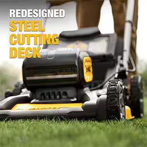 This kit includes two 10 Ah DEWALT 20V MAX batteries and chargers, providing cordless operation without fuel or cords. Multiple cutting height adjustments allow adaptation to different grass conditions.