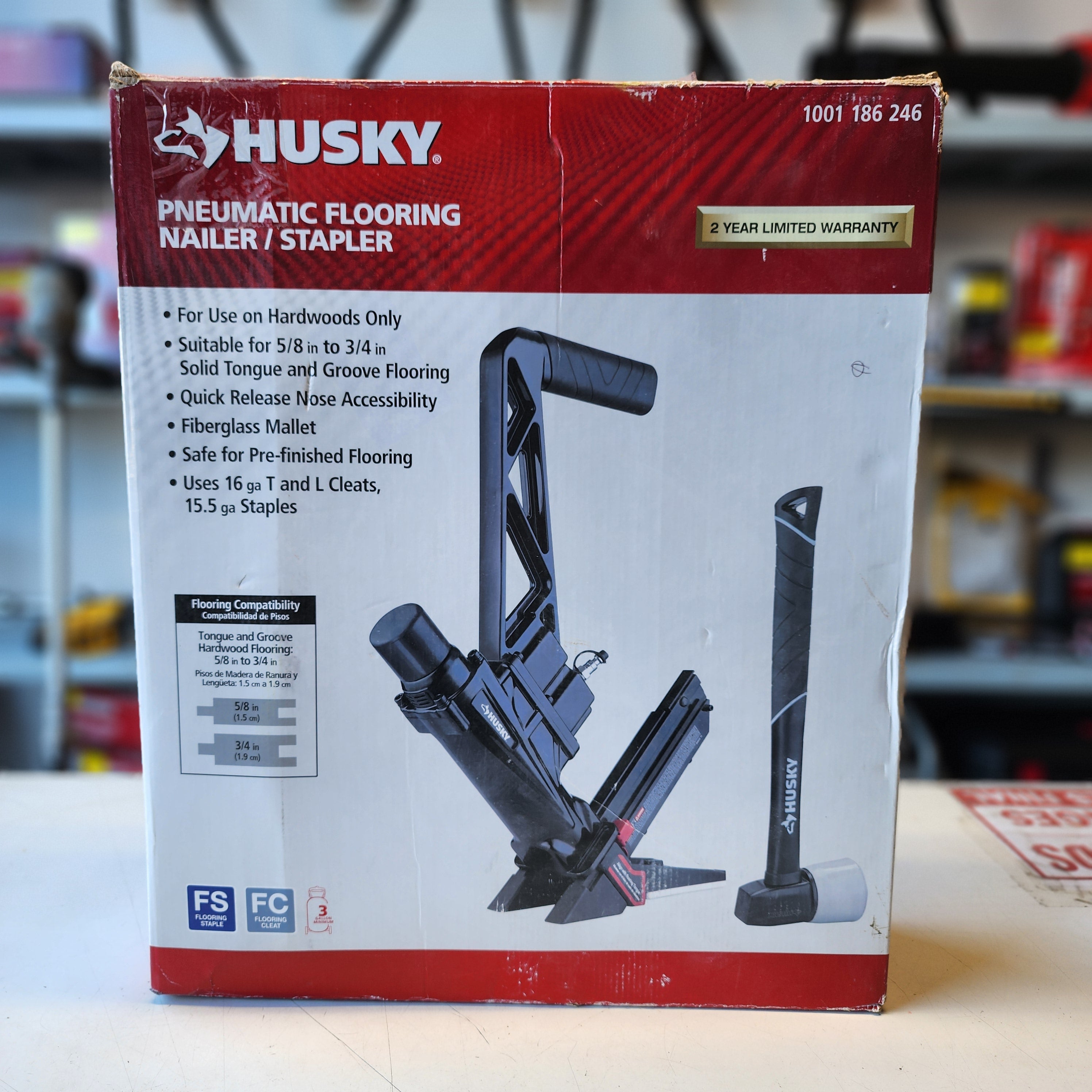 The Husky Pneumatic 3-in-1 Flooring Nailer and Stapler is built for efficient hardwood flooring installation and maintenance. Designed to handle both 15.5-gauge cleats and 16-gauge staples, this tool provides flexibility for various flooring applications while maintaining consistent fastening performance.
