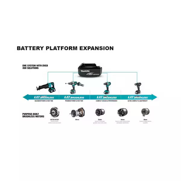 Makita 18V LXT Lithium-Ion 18-Gauge Cordless Brad Nailer (Tool-Only) operates on the Makita 18V LXT lithium-ion battery platform, allowing compatibility with other Makita 18V LXT tools.