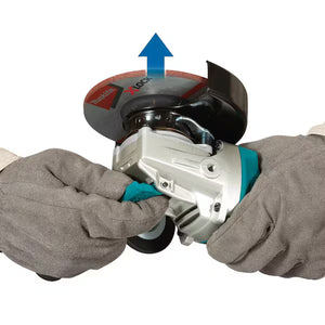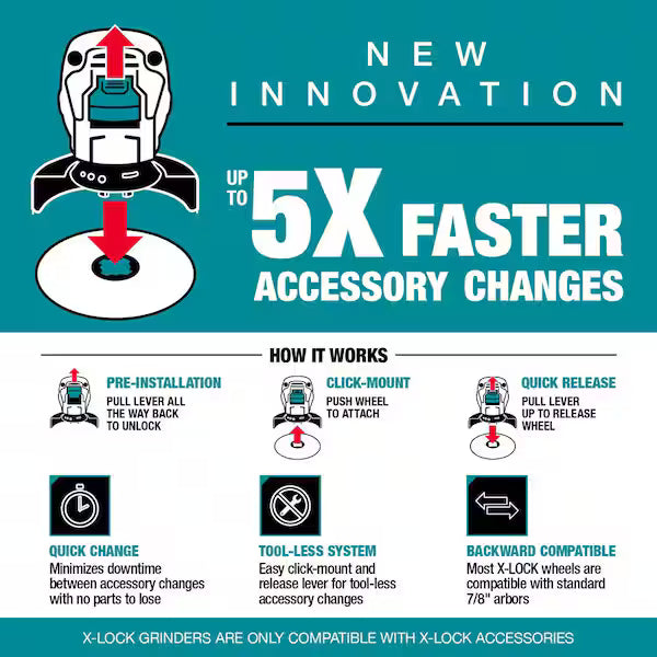 Makita 18V LXT Lithium-Ion Brushless Cordless 4-1/2 in./5 in. X-LOCK Angle Grinder, Tool Only uses the X-LOCK system to allow quick, tool-free wheel changes for improved efficiency and safety.