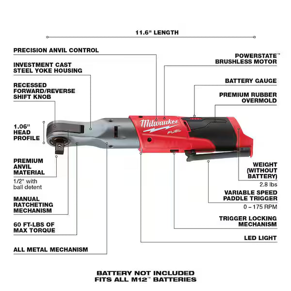 The Milwaukee M12 FUEL 12V Brushless 1/2 in. Cordless Ratchet is built for fast, controlled fastening in tight and hard-to-reach spaces. Its compact design and cordless setup make it a practical tool for mechanics and maintenance users who want quicker results without extra effort.
