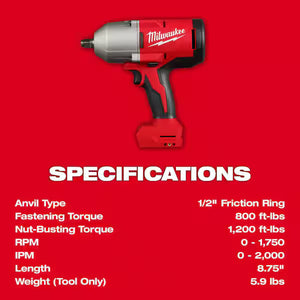 • Milwaukee M18 1/2 in. High Torque Impact Wrench (Tool-Only)
