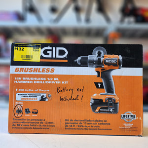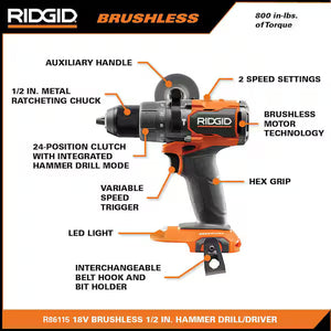 The RIDGID 18V Brushless 1/2 in. Hammer Drill/Driver Kit delivers cordless power and versatility for drilling and driving applications. Equipped with a brushless motor and 1/2-inch chuck, this drill is suitable for wood, metal, and masonry tasks.