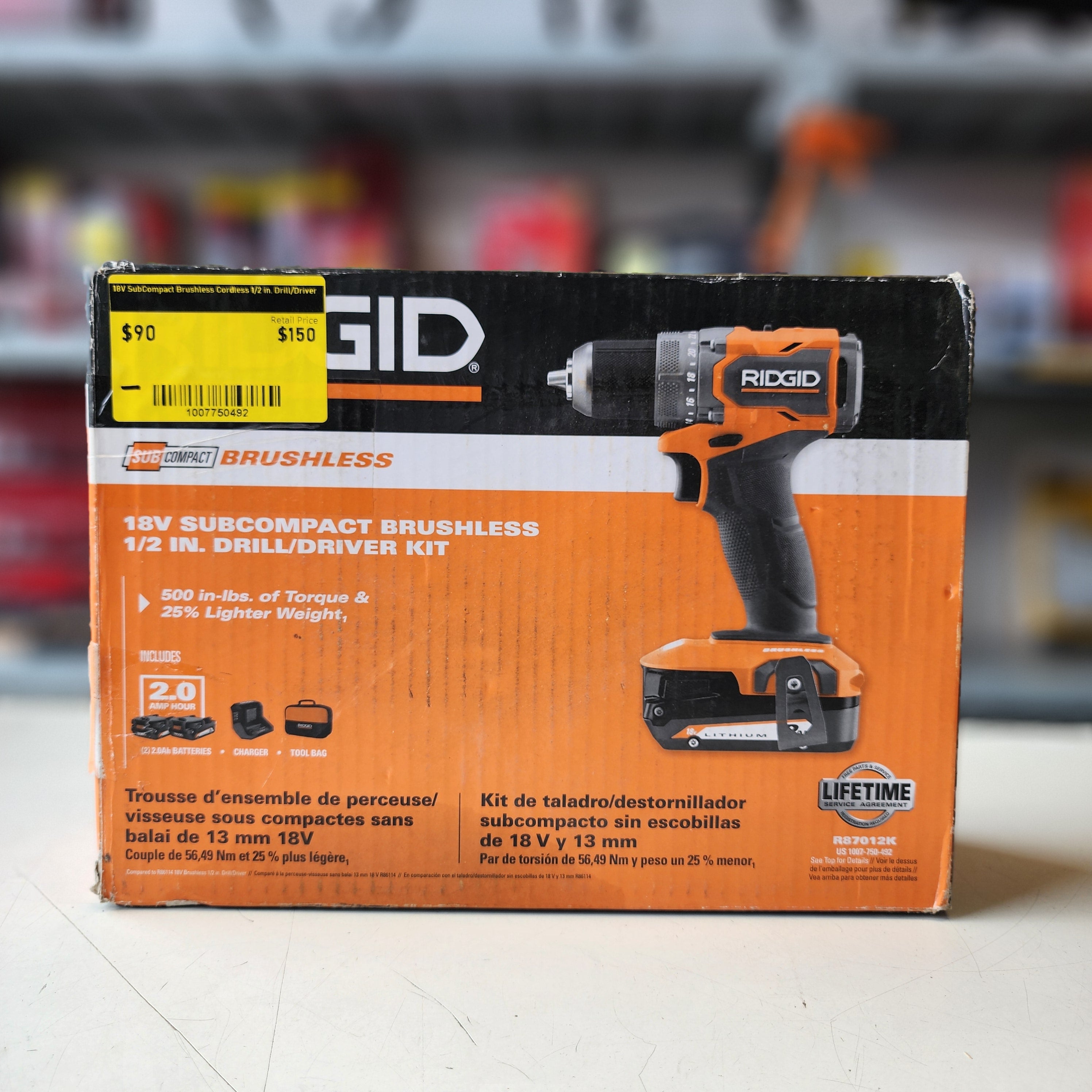 The RIDGID 18V SubCompact Brushless 1/2 in. Drill/Driver Kit is designed for reliable drilling and fastening in a compact form. Built on the RIDGID 18V platform, this kit includes two 2.0 Ah batteries, a charger, and a tool bag for convenient transport and storage.