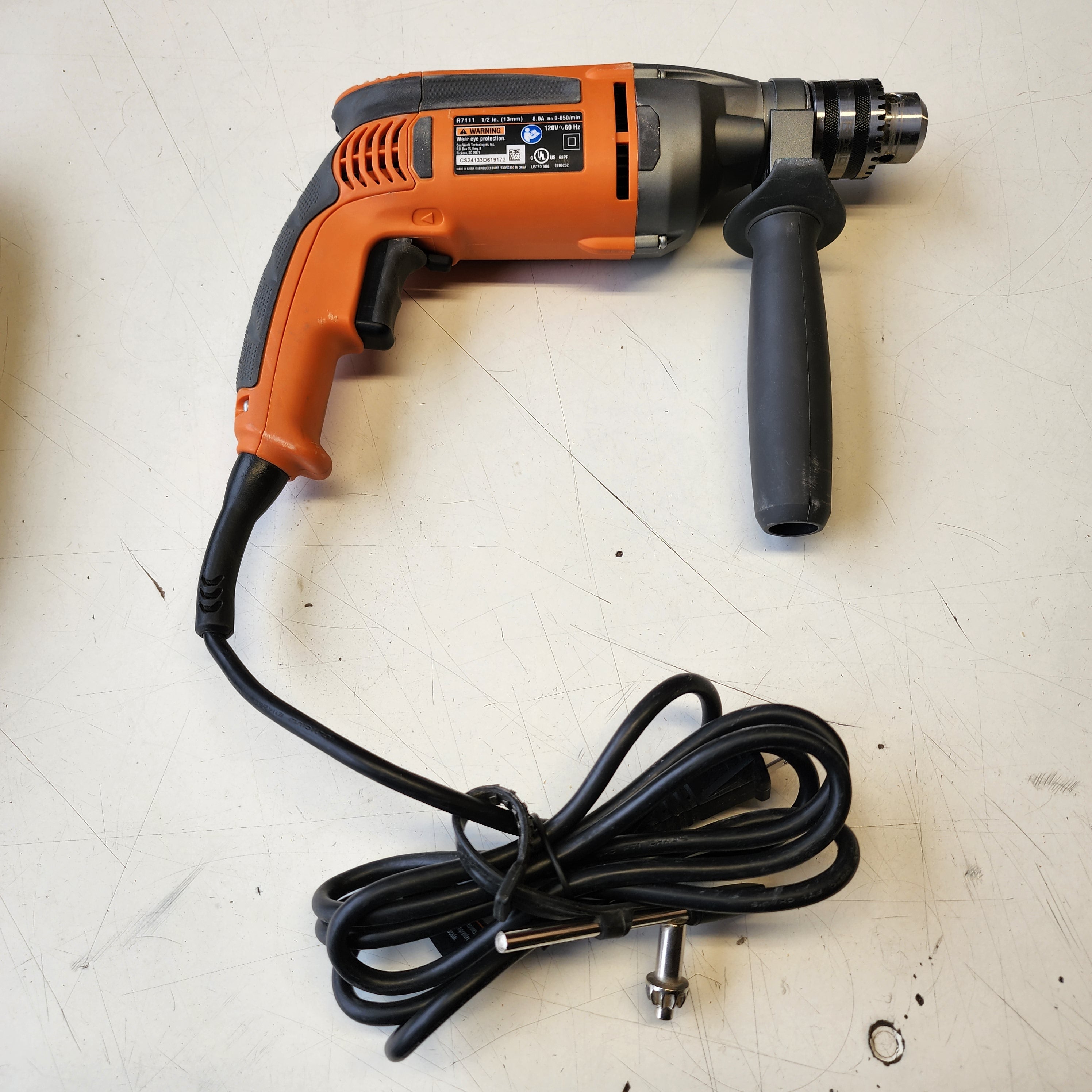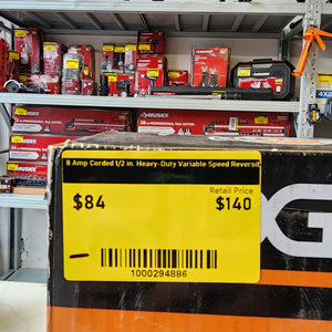 Heavy-duty corded drill made for tougher drilling jobs. The 8 amp motor gives strong power for wood, metal, and other materials. Variable speed trigger helps with control, and the reversible feature makes it easy to back out bits.