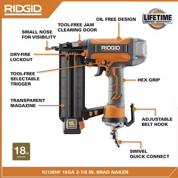 RIDGID Pneumatic 18-Gauge 2-1/8 in. Brad Nailer with CLEAN DRIVE Technology is built for trim and finish work.