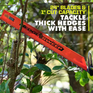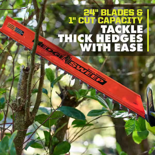 The 24-inch blade length provides extended reach for cutting larger hedges and long rows of bushes. Its cordless design allows greater mobility around yards and properties, making it suitable for residential landscaping and property maintenance.