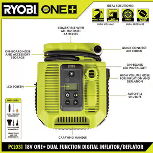 The RYOBI ONE+ 18V Cordless Dual Function Inflator/Deflator (SKU: 1010452063) is designed for inflating and deflating a variety of items such as vehicle tires, sports equipment, and household inflatables. The cordless design supports convenient portability for home, garage, and outdoor use.