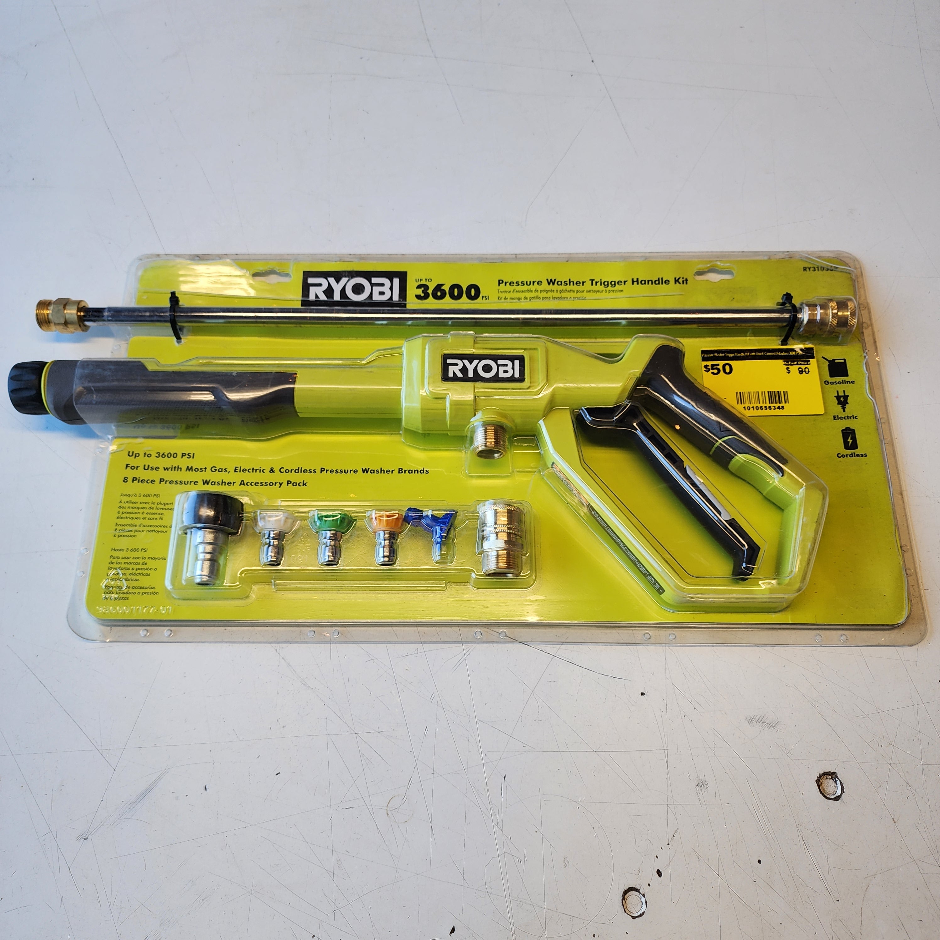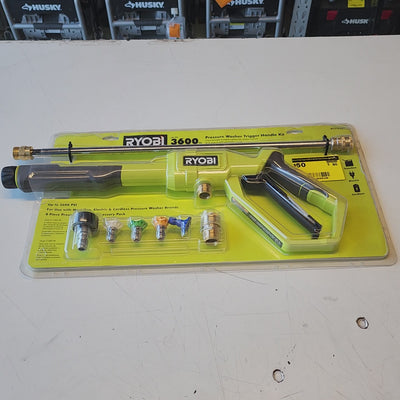 The RYOBI Pressure Washer Trigger Handle Kit is designed as a replacement or upgrade solution for pressure washers rated up to 3600 PSI. This kit includes a trigger handle, spray wand, quick-connect adaptors, and multiple spray nozzles to support various cleaning applications.