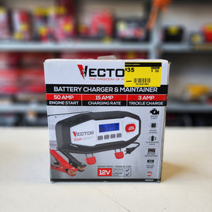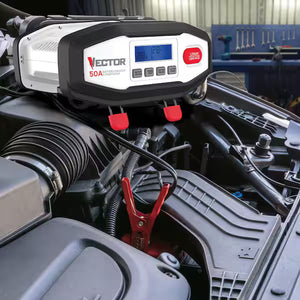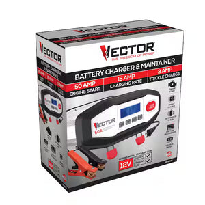The VECTOR 50 Amp Battery Charger and Maintainer is designed to charge and maintain automotive batteries. With up to 50 amps of charging capability, this unit supports battery recovery and routine maintenance for vehicles.